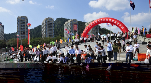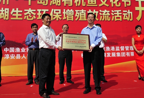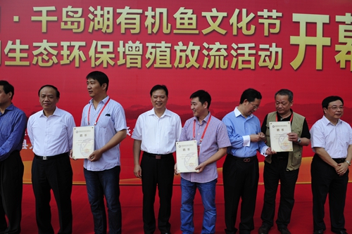 10月19日,由中國漁業(yè)協(xié)會、淳安縣人民政府共同主辦的中國杭州·千島湖有機魚文化節(jié)暨千島湖生態(tài)環(huán)保增殖放流活動隆重開幕。中國漁業(yè)協(xié)會常務(wù)副會長兼秘書長林毅、浙江省海洋與漁業(yè)局副局長張明、浙江出入境檢驗檢疫局副局長游忠明、杭州市農(nóng)業(yè)局副局長陳品南、杭州出入境檢驗檢疫局副局長王志剛,以及縣領(lǐng)導(dǎo)朱黨其、鄭志光、童小威、王曉林等出席開幕式。全國淳魚客戶代表、魚苗眾籌人士、魚拓大賽參賽選手、淳安縣相關(guān)部門負(fù)責(zé)人和市民代表也參加了開幕式。
