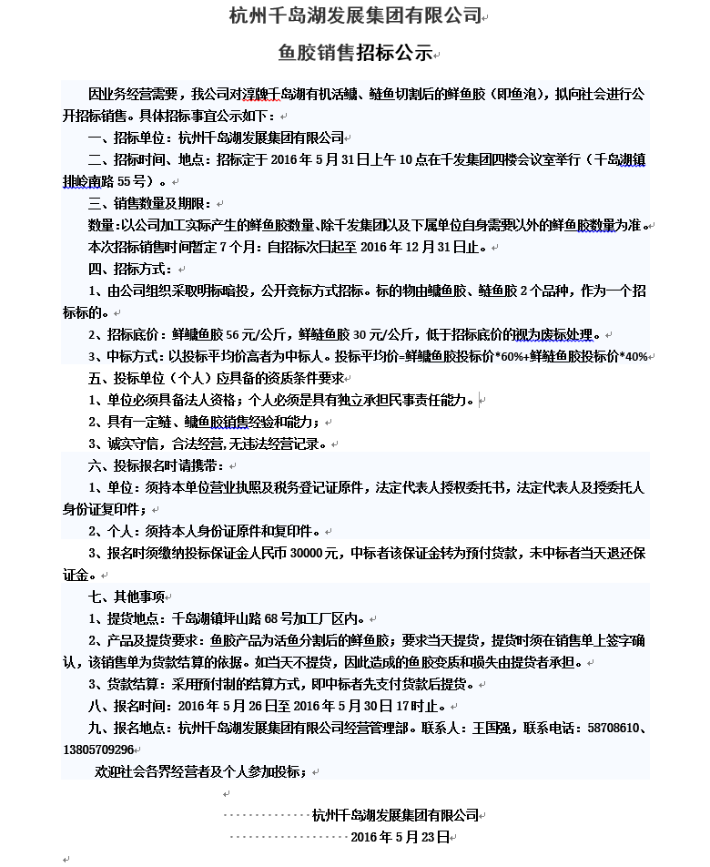魚(yú)膠銷售招標(biāo)公示