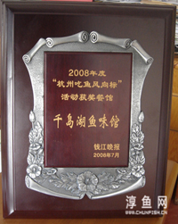 日前,在千島湖魚味館和公司新聞信息中心共同策劃參與的錢江晚報(bào) “2008杭州吃魚風(fēng)向標(biāo)酒店”的評(píng)選活動(dòng)中傳來(lái)佳音。千島湖魚味館榮獲錢江晚報(bào)“2008杭州吃魚風(fēng)向標(biāo)酒店”稱號(hào),這也是我縣唯一榮獲此項(xiàng)殊榮的酒店。