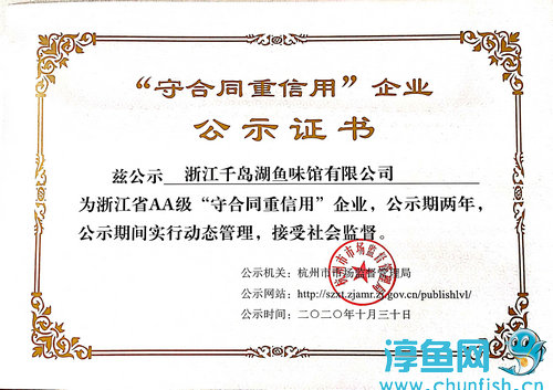 為促進企業(yè)合同管理和誠信建設(shè),根據(jù)《浙江省“守合同重信用”企業(yè)公示辦法》的規(guī)定,千島湖魚味館憑借行業(yè)地位、規(guī)范管理、誠實守信等優(yōu)勢條件,經(jīng)市、縣市場監(jiān)督管理局考核評審、社會公示,成功被認定為2020年度浙江省AA級“守合同重信用”企業(yè)。