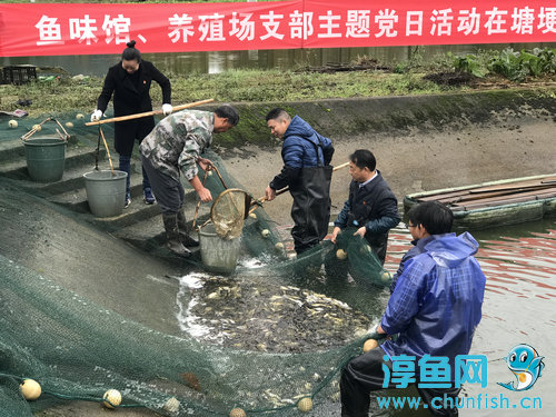 活動中,養(yǎng)殖場支部書記錢立柱同志介紹了千發(fā)集團產業(yè)鏈養(yǎng)殖基地分布、規(guī)模以及運作情況,并帶領魚味館支部全體人員現場參觀了邵家魚種場,體驗了標準化庫塘拖網。大家從傾聽到感知到體驗,深刻了解了淳魚養(yǎng)殖在產業(yè)鏈中的重要性,上了一堂現實版的塘埂黨課。
