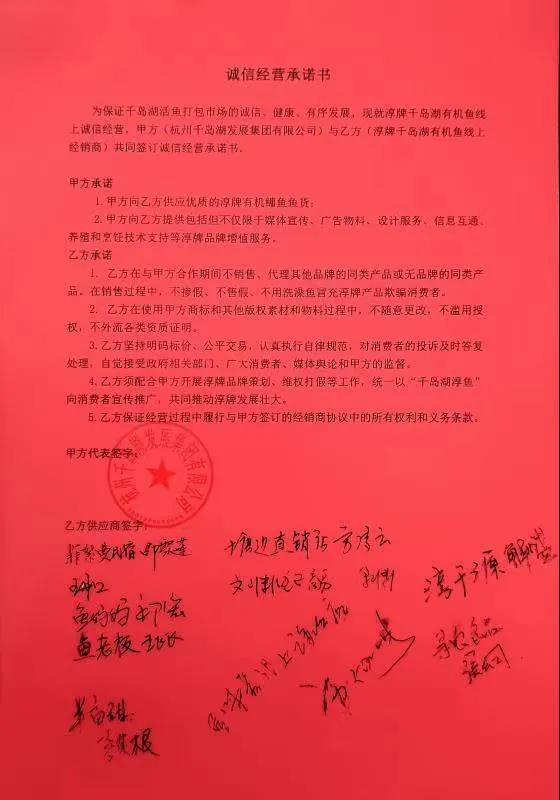 會議期間,淳魚線上經(jīng)銷商共同簽署了《誠信經(jīng)營承諾書》,共同承諾誠信經(jīng)營、不售假不摻假,共同推進(jìn)誠信市場建設(shè)。