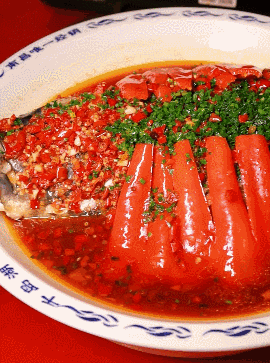 嚴(yán)嚴(yán)實(shí)實(shí)、滿滿當(dāng)當(dāng)?shù)亩缃蜂伾w在魚(yú)頭上整一個(gè)紅紅火火。辣椒鮮亮的紅映襯著蔥花清新的綠,撥開(kāi)的雪白魚(yú)肉掩映其中。