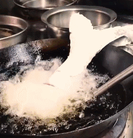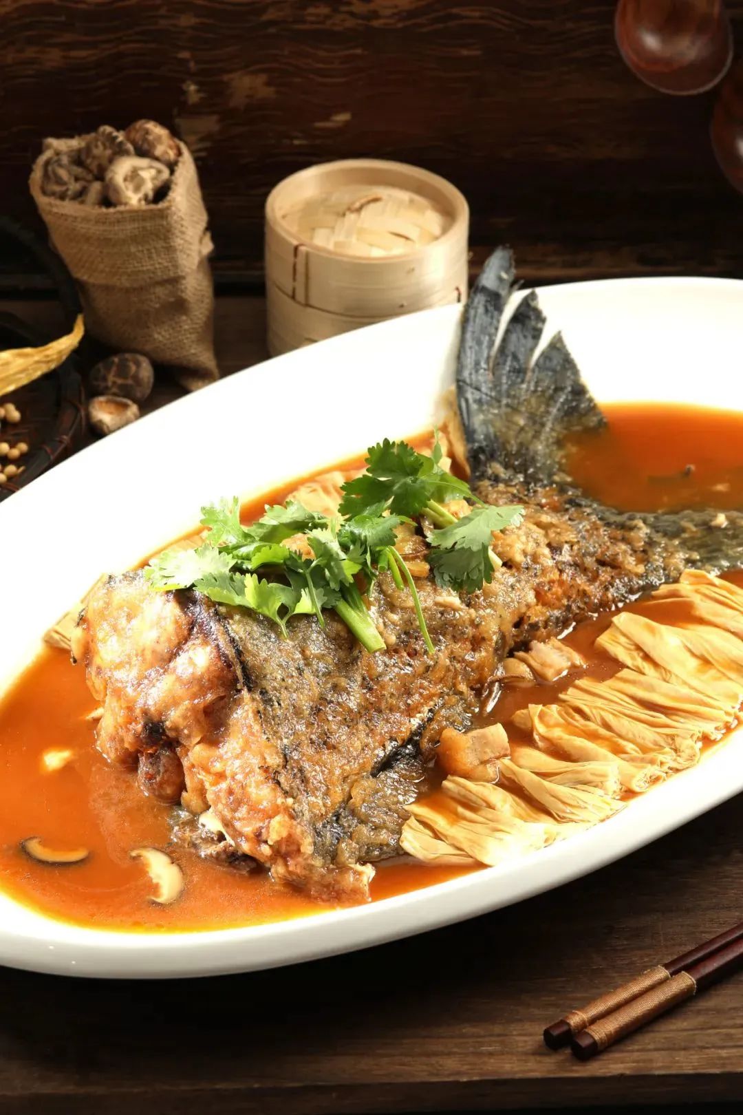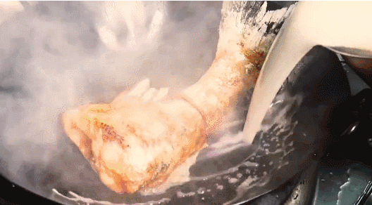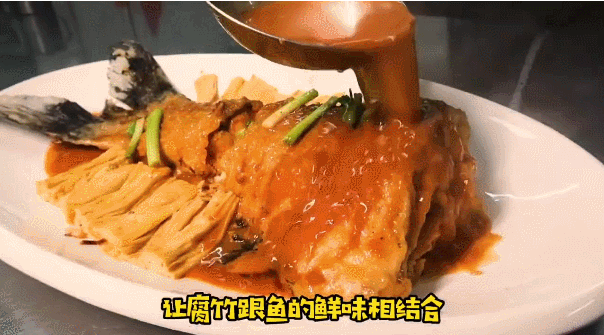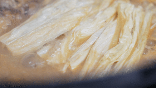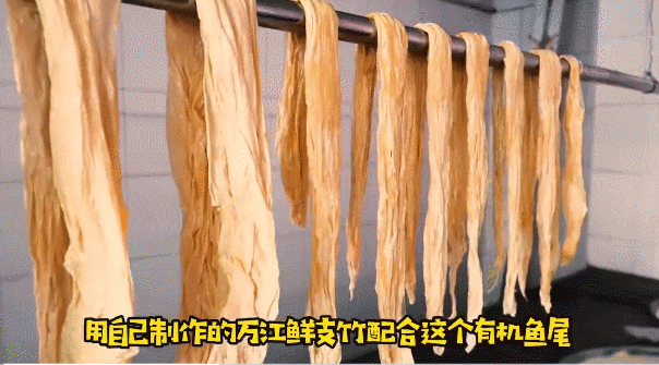 入鍋過油的魚尾,炸至金黃酥脆,與上湯慢火炆40分鐘后放入鮮支竹同煮。