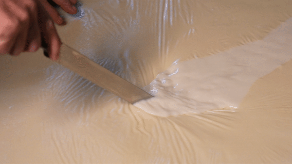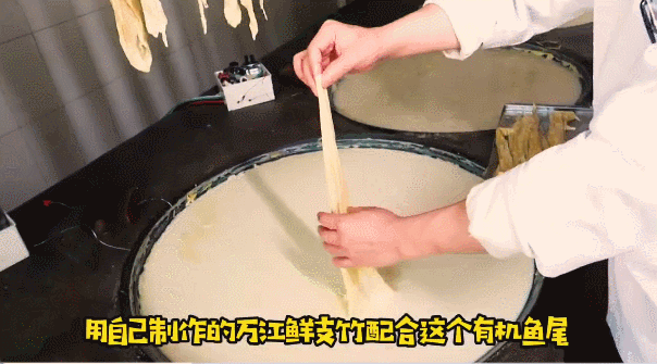 為了保證食材的新鮮與口感,莞香樓堅持每日自己制作鮮支竹。磨出的豆?jié){上爐加熱,隨時注意控制火候,每隔20分鐘會出現(xiàn)一層薄薄的油皮,小刀微微輕輕劃開,手指輕捻、提拉一氣呵成,就做成了令人著迷的細薄如衣、潤滑如脂、飽含豆香的嫩支竹。