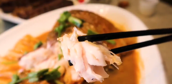 秘制黃椒醬,色澤黃亮,清香濃郁,在蒸好的筍殼魚上鋪上一層,光看顏值就足夠誘人了!筍殼魚肉質(zhì)鮮嫩少刺,用筷子夾起來像布丁一樣微微顫抖,細細品嘗,口感順滑像豆腐一般,搭配黃椒醬,香與嫩相互碰撞,糅雜著黃椒醬的魚肉,酸甜辣度掌握恰到好處,一口根本停不住!