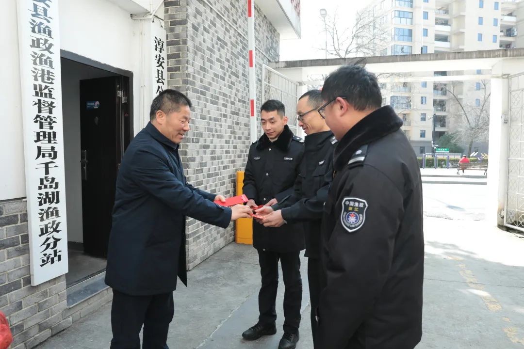 千發(fā)集團黨委書記、總經理何光喜和淳安縣農業(yè)農村局黨委委員、農業(yè)行政執(zhí)法大隊專職副大隊長彭革東分別帶隊來到了千島湖西南、西北、東南、東北以及千島湖分站等5個漁政分站18個管理組,捕撈一隊船隊及淳魚靜養(yǎng)基地、起魚碼頭、攔網管理組等地,詳細詢問了各崗位春節(jié)期間值守和后勤保障情況。