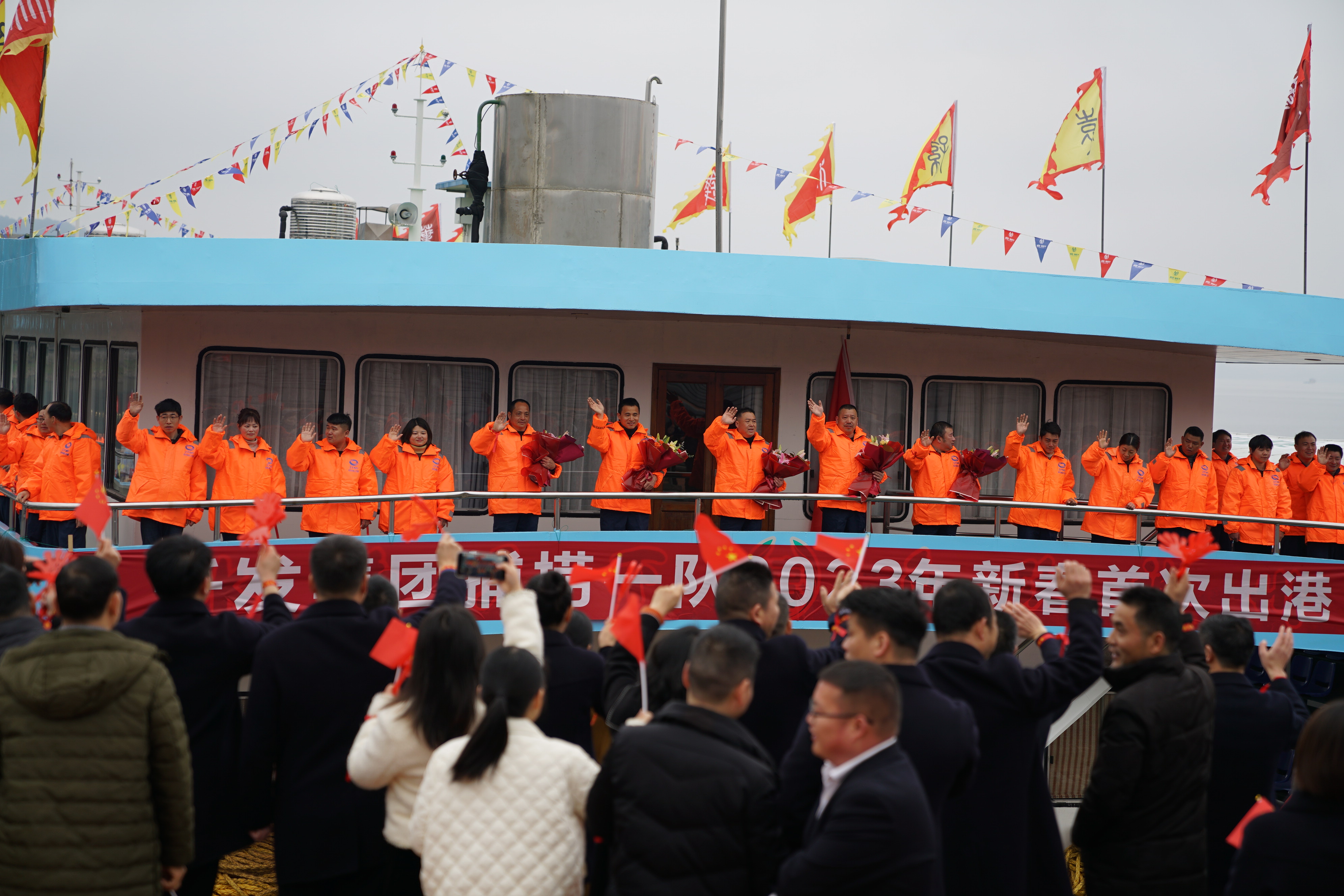 隊(duì)員們整裝待發(fā),在揮手致意與祝福中,千發(fā)集團(tuán)捕撈隊(duì)即將踏上新年的征程!