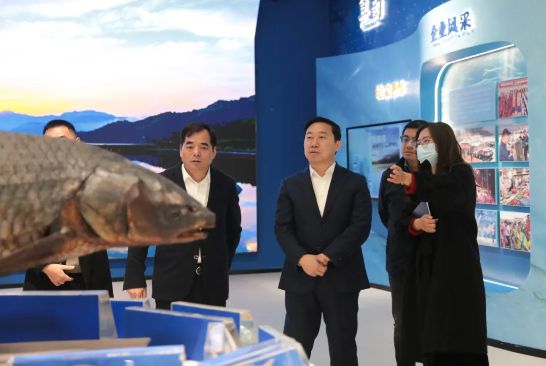 在魚博館講解人員的介紹下,考察團(tuán)一行詳細(xì)了解了紅色華章、綠色理念、藍(lán)色智慧三大板塊所蘊(yùn)含的企業(yè)文化,對千發(fā)集團(tuán)集“養(yǎng)殖、管護(hù)、捕撈、加工、銷售、科研、烹飪、旅游、文創(chuàng)、推廣”一體的完整漁業(yè)產(chǎn)業(yè)鏈有了系統(tǒng)性認(rèn)識。張金龍主席表示,千發(fā)集團(tuán)所開創(chuàng)的千島湖保水漁業(yè)模式,為有著“中國鯽魚之鄉(xiāng)”稱號的資陽區(qū)未來發(fā)展提供了更多可借鑒的經(jīng)驗。