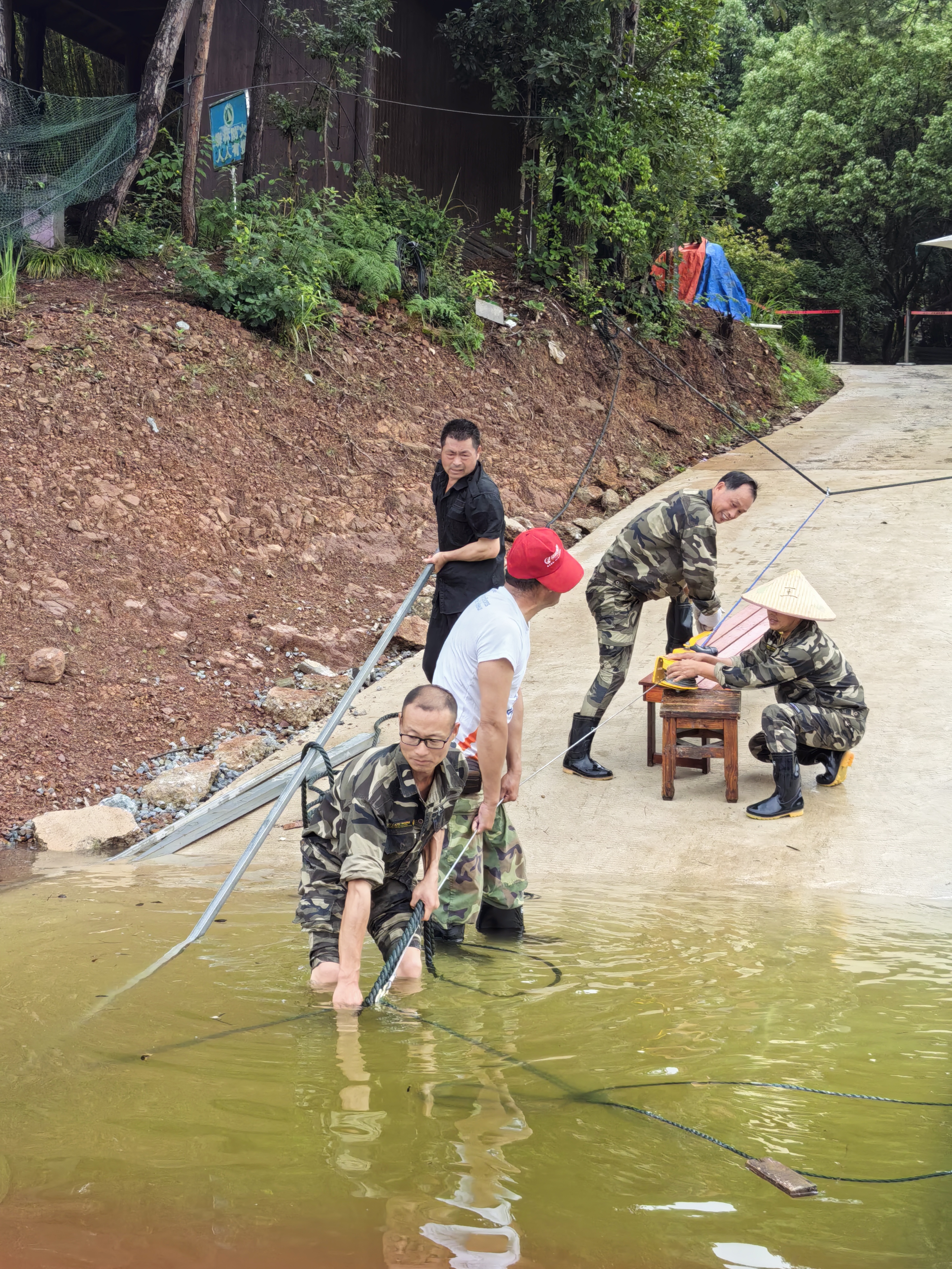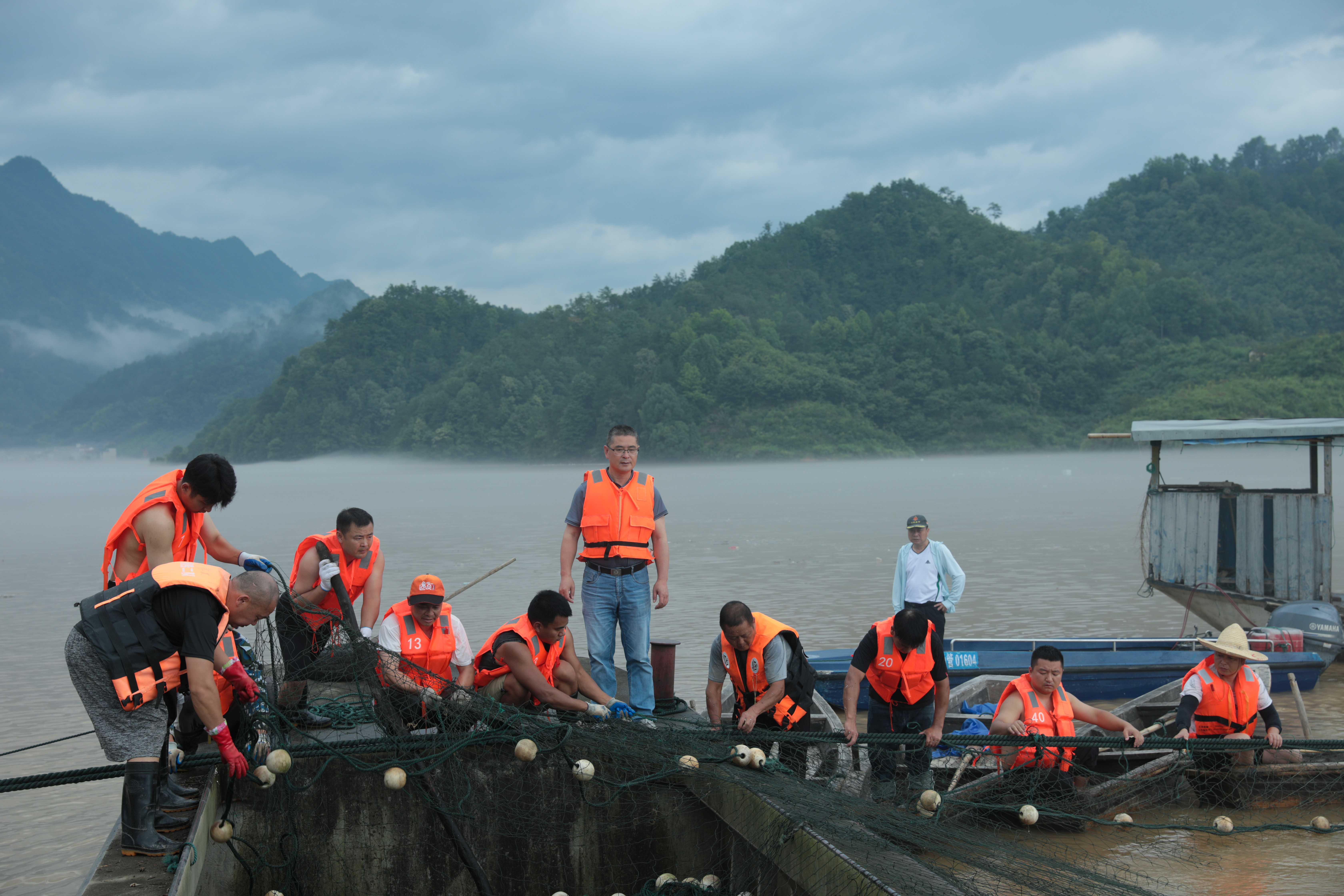 緊接著,6月23日,等洪水流速稍緩,全體人員冒雨搶收被洪水摧毀的網(wǎng)具。