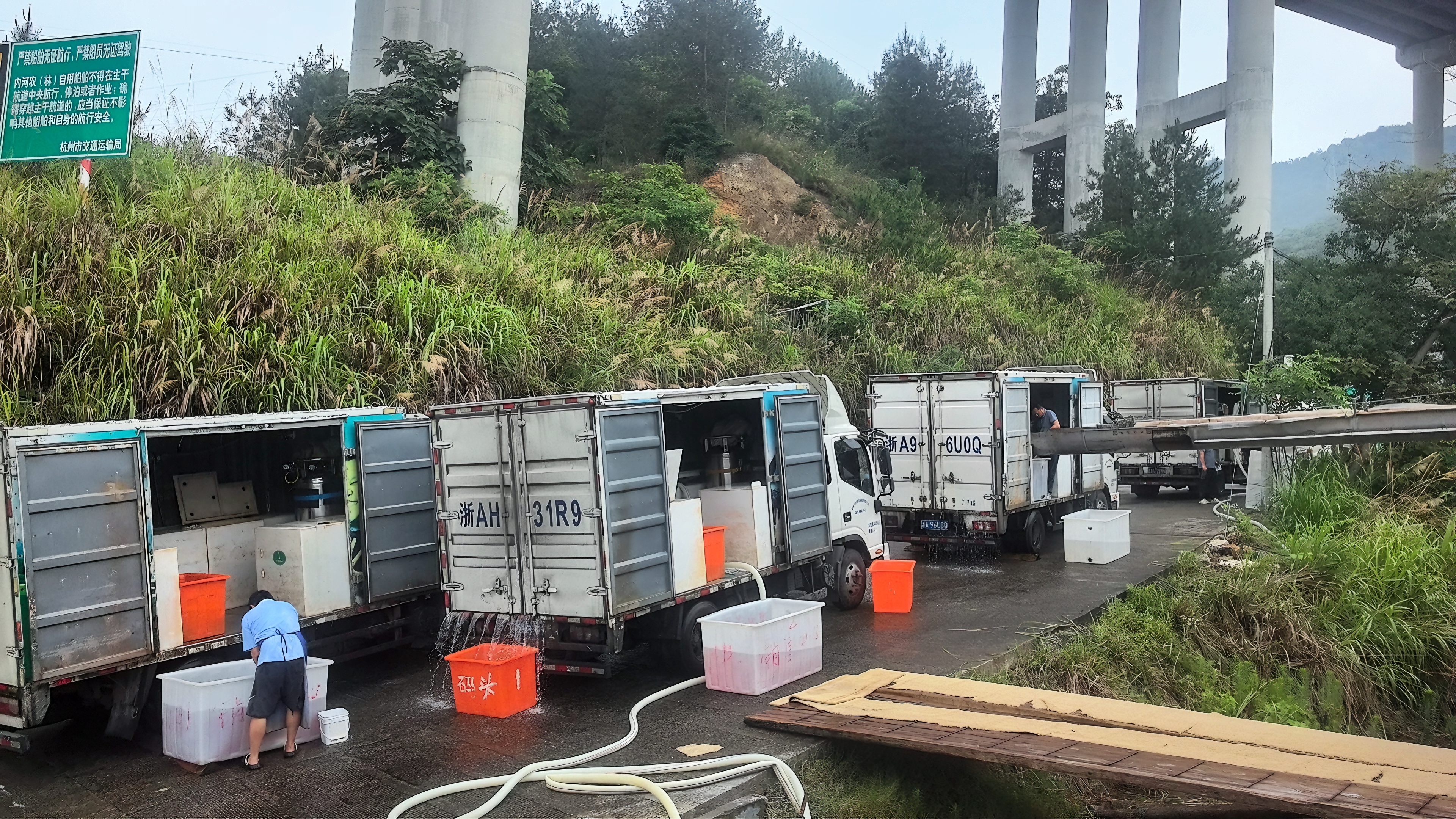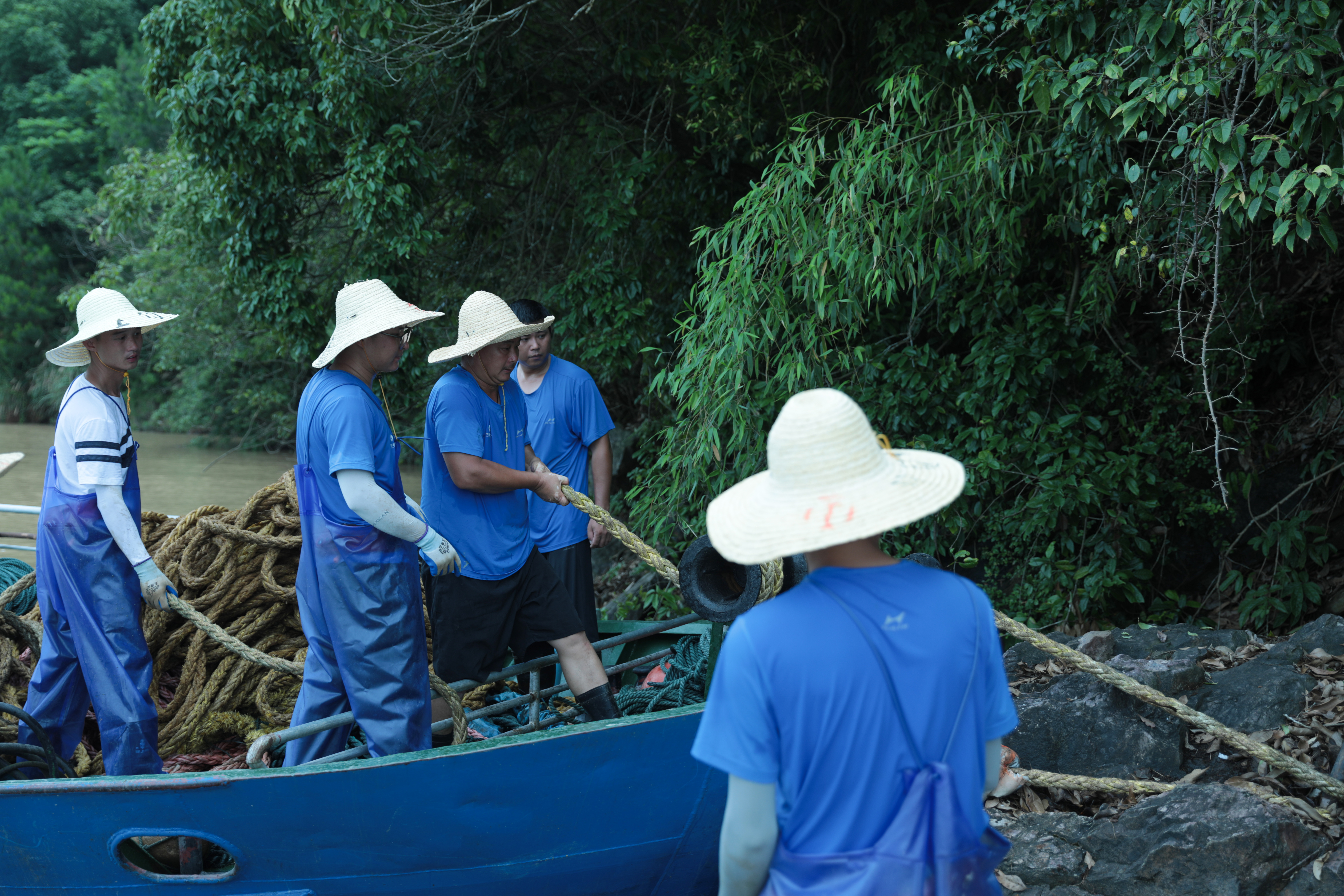捕撈隊員冒雨作業(yè)現(xiàn)場