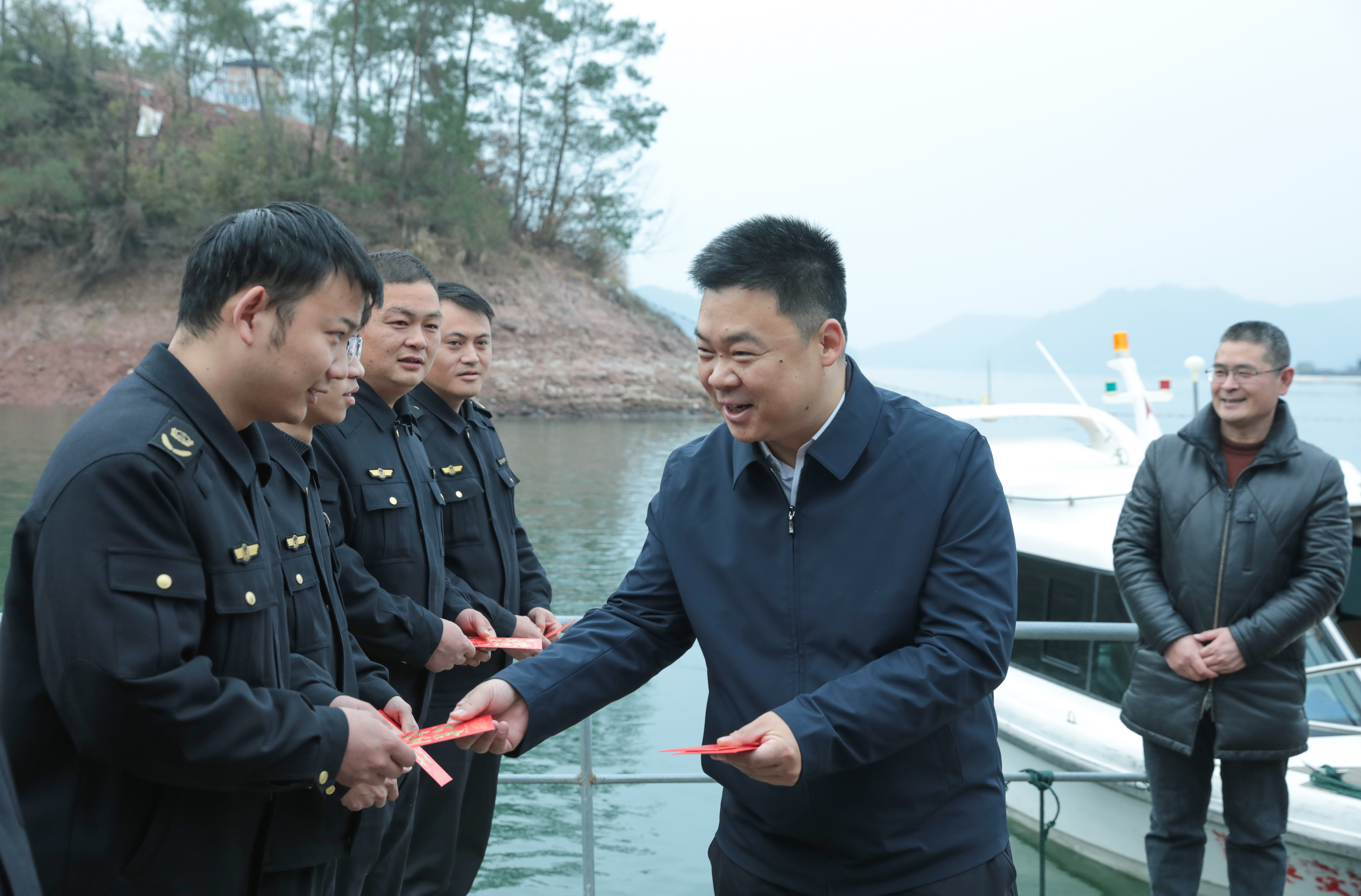 淳安縣人民政府副縣長(zhǎng)余飛帶隊(duì)深入千島湖湖區(qū),慰問(wèn)“一支隊(duì)伍管執(zhí)法”春節(jié)一線值守人員。千發(fā)集團(tuán)黨委書(shū)記、總經(jīng)理何光喜,縣綜合行政執(zhí)法局黨委委員、副局長(zhǎng)方迎強(qiáng)等陪同慰問(wèn)。