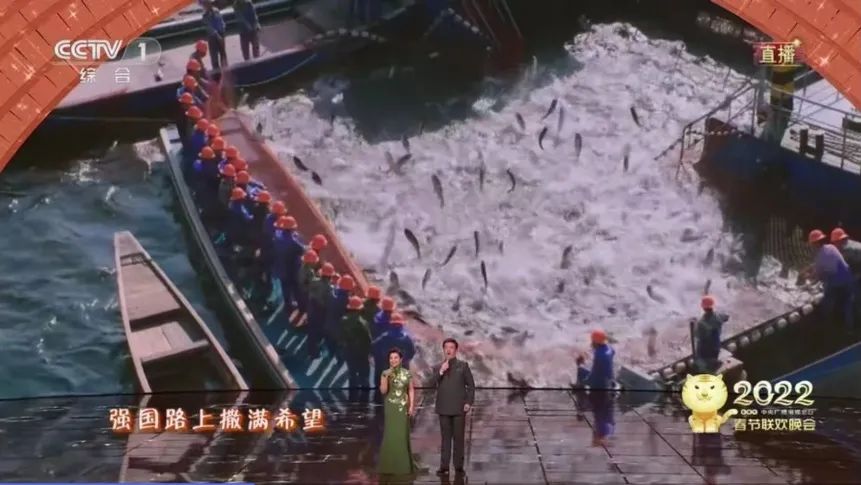 歌曲《偉業(yè)》聚集了三十多位來自各行各業(yè)的勞動者代表,他們用激昂豪邁的歌聲唱出“中國式現(xiàn)代化新征程上,每一個人都是主角對時代心聲。在他們身后的大熒幕上,來自千島湖的壯觀景象——巨網(wǎng)捕魚躍上了春晚的舞臺。