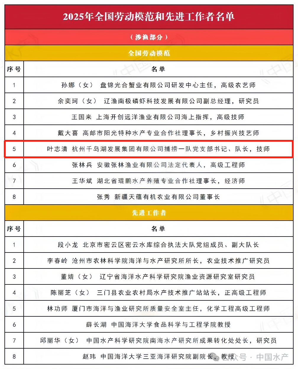 值得一提的是,在本次全國勞動模范表彰名單中,漁業(yè)相關人員僅有 8 位。葉志清同志作為其中一員,無疑是全體漁業(yè)工作者的杰出代表。